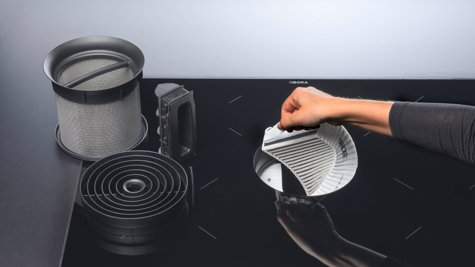 Tous les systèmes BORA sont dotés d’un indicateur de changement de filtre. Une perte de puissance d’aspiration ou la perception d’une odeur indiquent également qu’il est nécessaire de changer le filtre à odeurs à charbon actif.