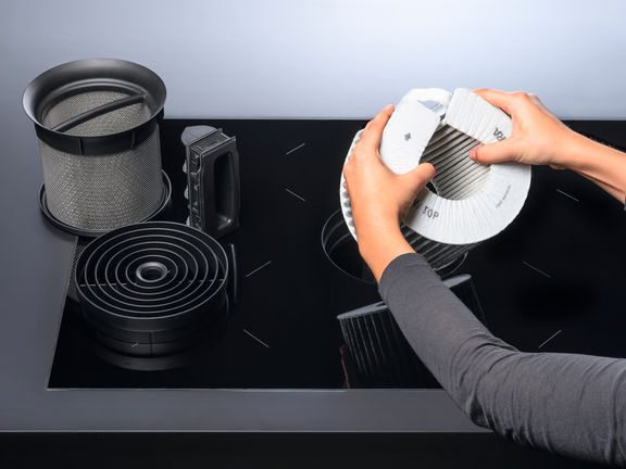 Le filtre à graisse en acier inoxydable ainsi que toutes les autres pièces détachables des systèmes d’aspiration sur table de cuisson peuvent être nettoyés au lave-vaisselle. Veuillez noter en revanche que vous ne pouvez pas nettoyer le filtre à odeurs à charbon actif. Celui-ci doit être remplacé une fois sa durée de vie écoulée.