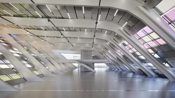 Opvallend zijn ook de verschillend gekleurde glazen elementen die de anders geperforeerde stalen gevel visueel breken. Dit is gerecycled materiaal. En het gebied waarop het gebouw wordt gebouwd, wordt als het ware ook "gerecycled". Lange tijd stond daar een oud sporthotel dat niet meer in gebruik was.