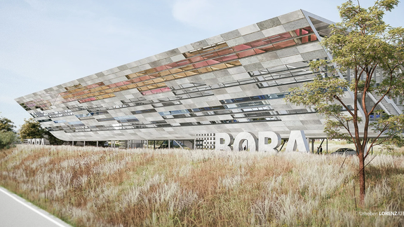 Niet alleen werd het gebouw "met een wow-effect" in een mum van tijd gecreëerd, maar de moderne voorgevel, die naar voren helt, lijkt ook te zijn gevormd door een sterke wind. De ongeveer 100 meter lange "vleugel" met zijn lenticulaire doorsnede troont op een filigrane draagstructuur, die een hoge mate van transparantie mogelijk maakt en het gebouw de indruk geeft dat het zweeft. Het symboliseert de opleving en toekomstgerichtheid van BORA.
