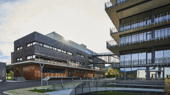 Het nieuwe kantoorgebouw bevindt zich op het hoofdkantoor in Tirol, in het midden van de twee bestaande gebouwen AT I en AT II. AT III is verbonden met de afdeling Onderzoek en Ontwikkeling in AT II en met onze "Hälzyba" in het naburige AT I via twee verbindingsbruggen van wel 20 meter lang. Dit zorgt niet alleen voor een lekkere, gezonde lunch voor onze werknemers op korte afstand, maar is ook gunstig voor een bedrijfscampus met korte afstanden.