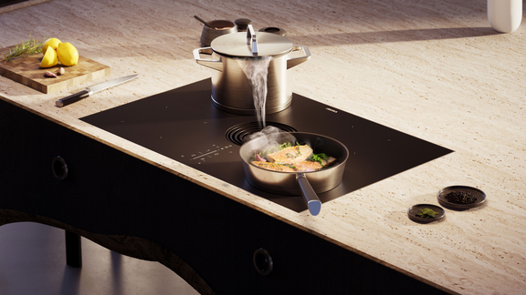 Vier kookzones in twee maten maken optimaal gebruik van de kookvelddiepte van 51,5 cm – achter is voldoende ruimte voor klein kookgerei, terwijl vooraan grote potten en pannen hun ideale plek vinden.
