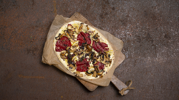 Meng de ingrediënten voor het flammkuchendeeg deeg tot een glad deeg en laat 15 minuten rusten.