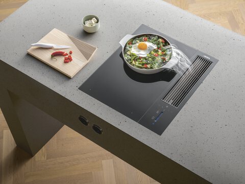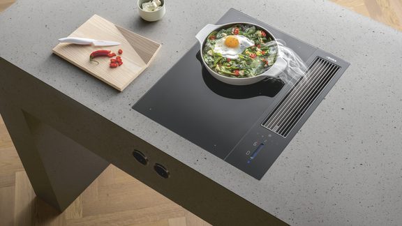 Dankzij de centrale bediening bij de afzuiging gaat er geen plaats verloren en ontstaat er een bijzonder grootkookoppervlak, waarop vier kookpotten van max. 24 cm tegelijkertijd kunnen worden geplaatst. De grote oppervlakte-inductiekookzones garanderen zelfs bij zeer grote kookpotten of braadsleden een volledige en gelijkmatige verwarming. Ook met een vol kookveld blijft het achtergrondgeluid aangenaam en relaxed, dankzij de optimale luchtgeleiding in het toestel zelf – zelfs wanneer het toestel op volle kracht draait.