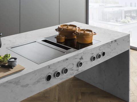 Bij het activeren van de afzuiging gaat de afsluitklep automatisch open en dicht. In uitgeschakelde modus is het systeem volledig gesloten. De afzuigregeling werd professioneel geoptimaliseerd met automatische detectie en aanpassing aan het respectieve kookveld. Het afzuigvermogen wordt dus onafhankelijk geregeld op basis van het huidige kookproces; de kookveldafzuiging en kookvelden communiceren met elkaar. De stille motor zorgt ervoor dat de afzuiging ook op hoge vermogensniveaus fluisterstil blijft. Onderdelen die in contact komen met de kookdampen, kunnen via de goed toegankelijke en brede instroomopening eenvoudig worden verwijderd en mogen gewoon in de vaatwasser, zonder dat de kwaliteit eronder te lijden heeft.