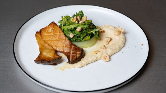 Leg de gebakken kruisdisteloesterzwammen erop en garneer met hazelnoten.