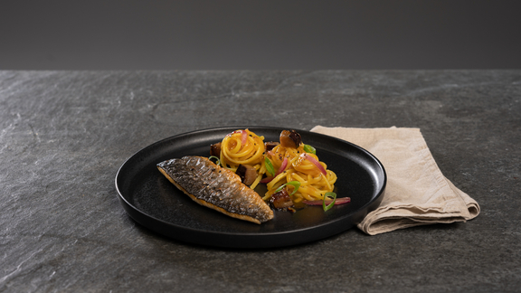 Wash the char fillets, pat dry with kitchen roll, season with salt and sear for about 5 minutes. Add the aubergine and sear again.