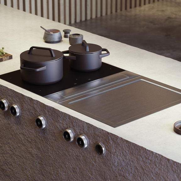 Naše največje kuhalne plošče z globino 540 mm lahko individualno izberete glede na svoje želje pri kuhanju: od FLEX-indukcije do plinske kuhalne plošče ali Tepan nerjavnega žara, ki jih je mogoče prosto kombinirati s sistemom odvoda pare. Možne so tudi kombinacije z eno, tremi ali več kuhalnimi ploščami.